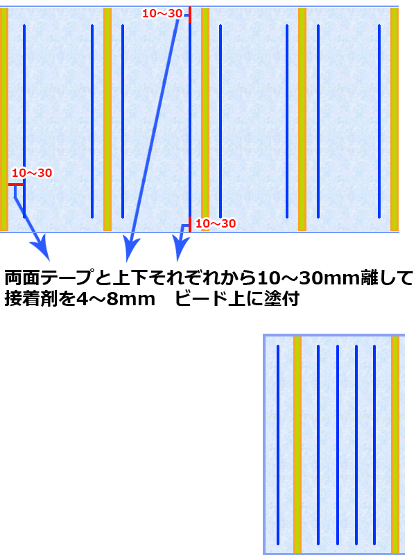 - 薄くたわみやすい材料や重い材料では接着剤のビード径を小さく、塗付本数を増やす。